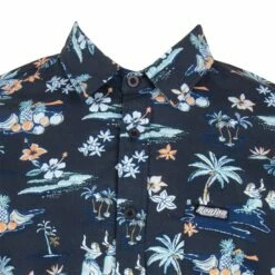 The Billabong Ron Jon Cocktail Black Tank features a graphic of a skull being used as a cocktail glass, complete with a lemon wedge and tiny umbrella. Around the skull are tropical plants and the words Ron Jon Billabong.