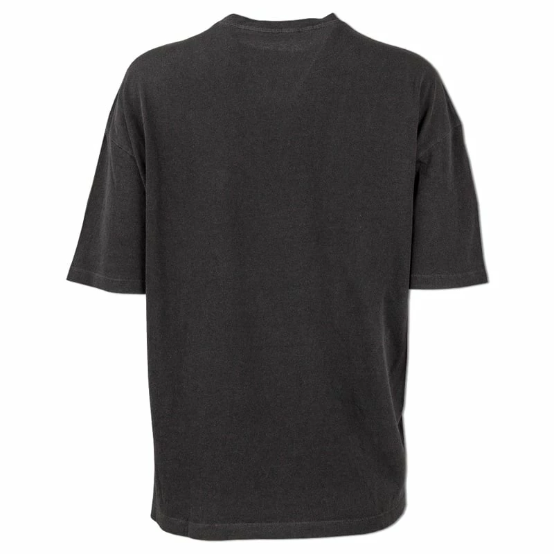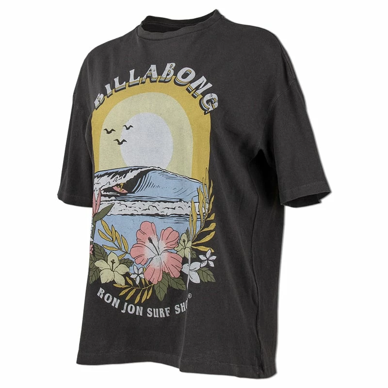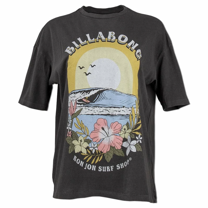 The Billabong Ron Jon Juniors Check My Vibe Tee features a graphic of a faded beach scene with a surfer riding waves in the distance. Above the scene is the word Billabong and below it are flowers and the words Ron Jon Surf Shop.