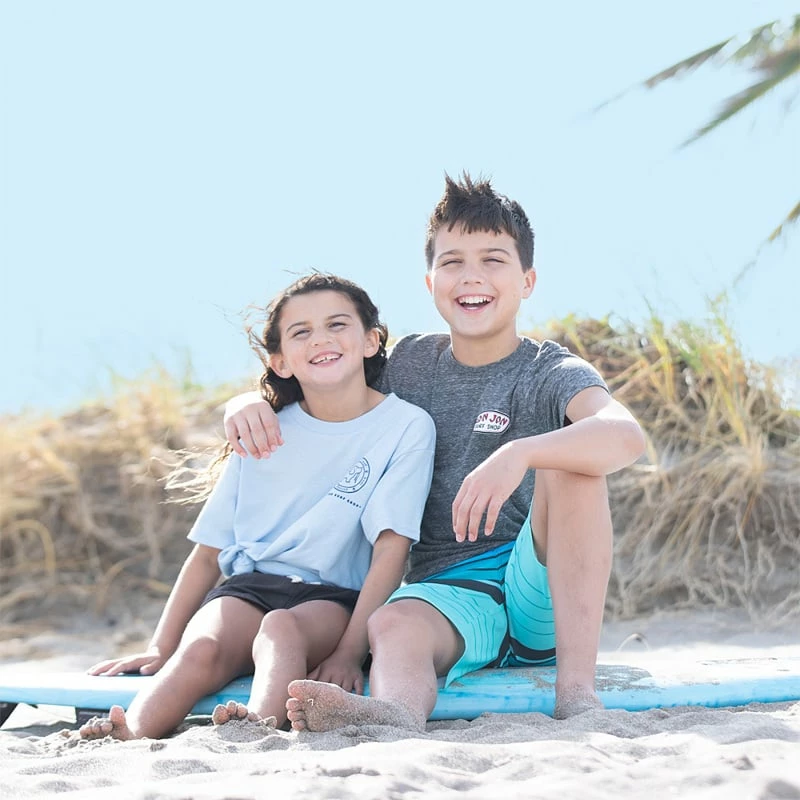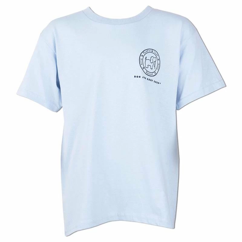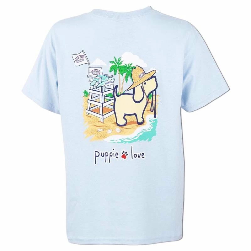 Show your love to animals with the Puppy Love Ron Jon Kids Lifeguard Pup Tee. This shirt features a beach scene with an adorable puppy wearing a Ron Jon lifeguard hat on the beach. Behind the puppy is a sea turtle watching over them from the lifeguard chair.Â