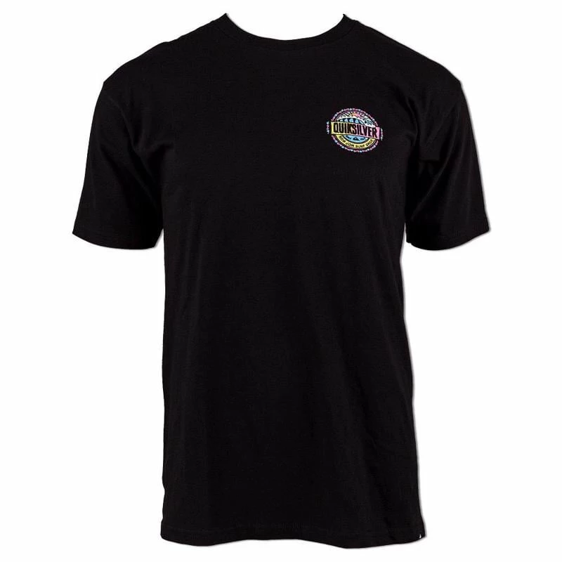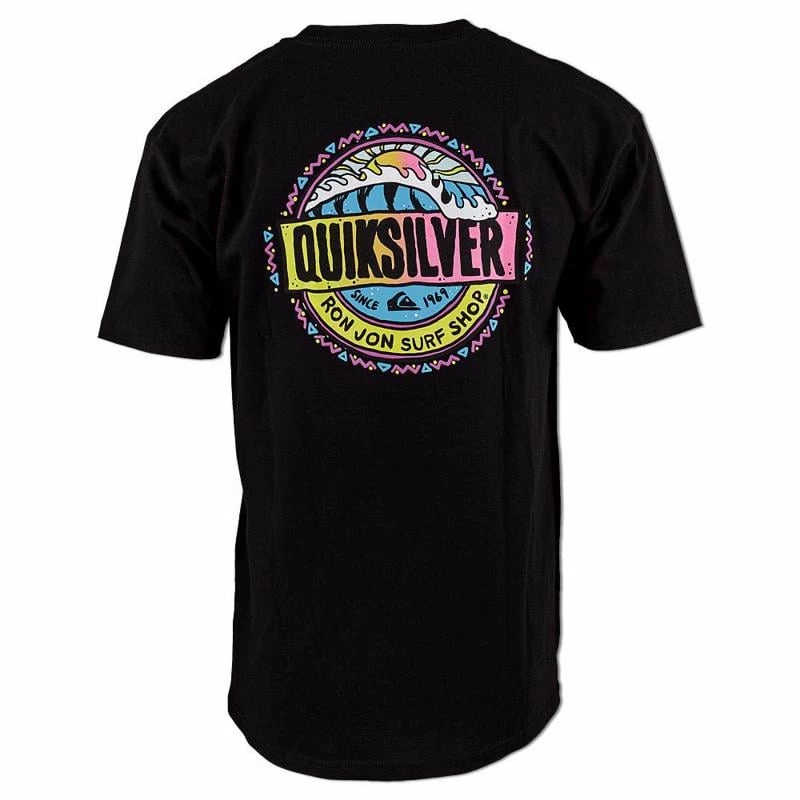 The Quiksilver Ron Jon Black Break Loose short-sleeve tee features a retro tribal graphic in bright colors. Large graphic on the back with a smaller design on the front.