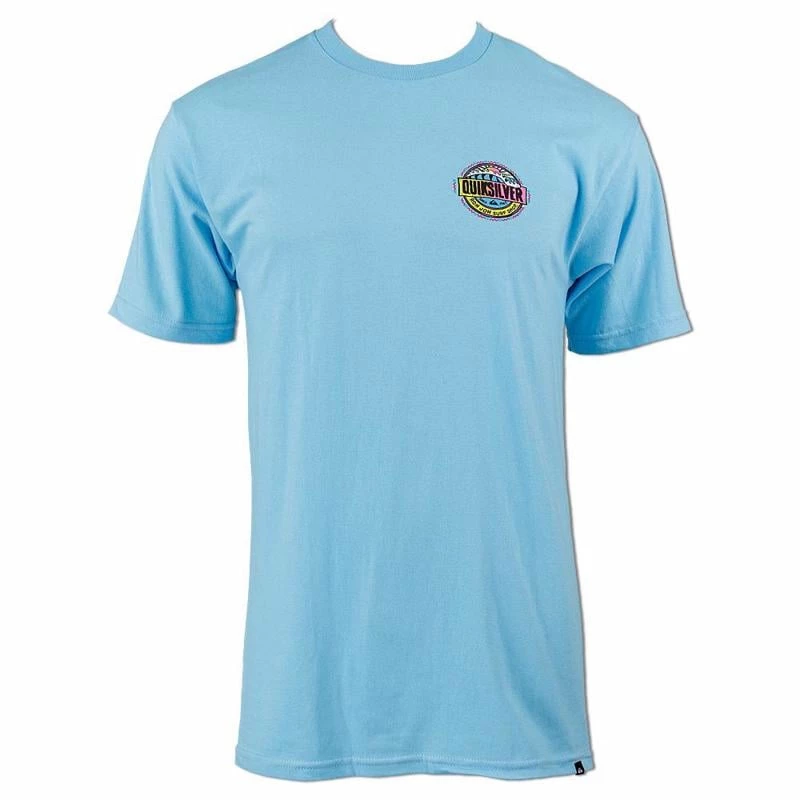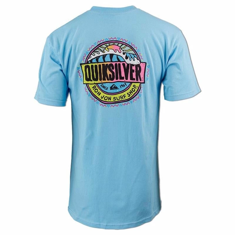 The Quiksilver Ron Jon Pool Blue Break Loose short-sleeve tee features a retro tribal graphic in bright colors. Large graphic on the back with a smaller design on the front.