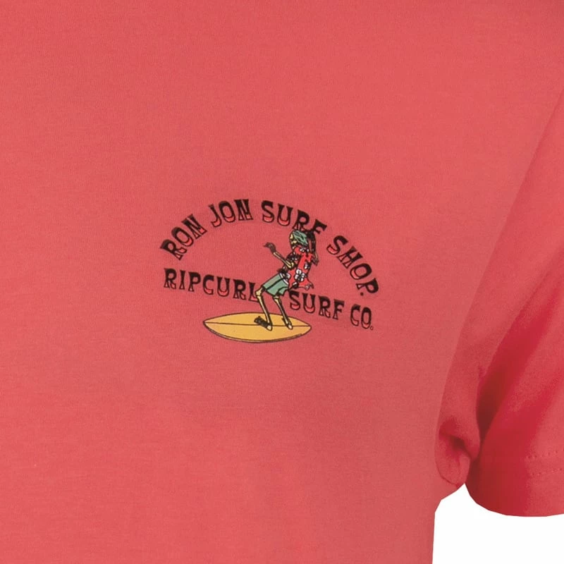 The Rip Curl Ron Jon Coral Skelly Short-Sleeve Tee features graphics of a skeleton wearing a Hawaiian shirt and boardshorts riding a surfboard. Both companies’ names are included in the graphics.