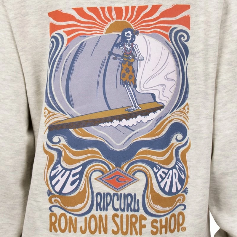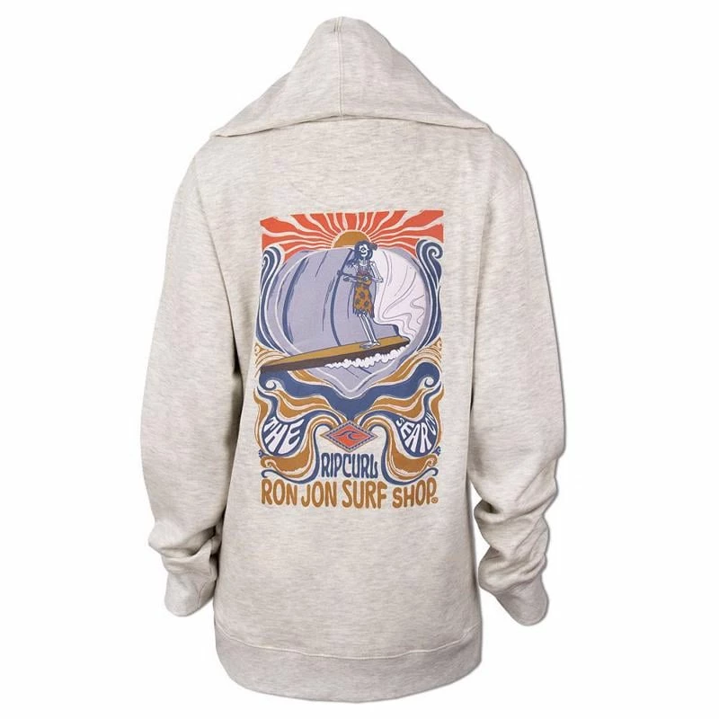 The Rip Curl Ron Jon Juniors Shredder Zip Hoodie features a lady skeleton playing a ukulele while surfing through a large wave.Â