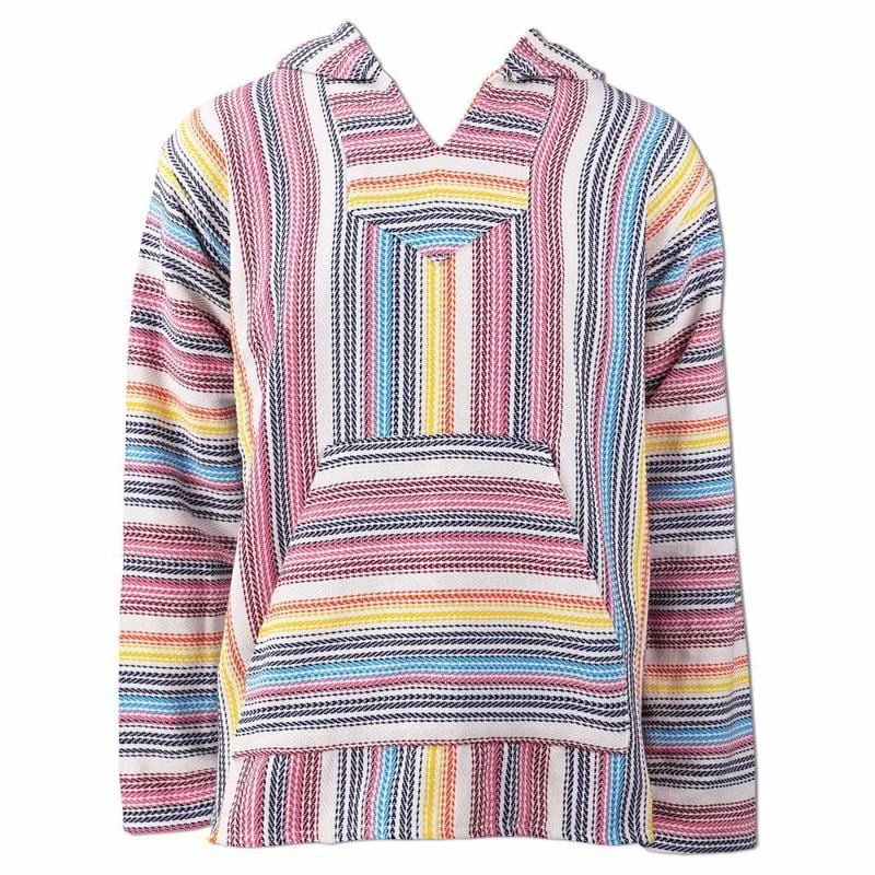 The Ron Jon Cotton Blend Pinstripe Baja Pullover is a colorful way to stay warm this fall. It features a hood and a front pouch pocket with a fuzzy interior to keep your ears and hands warm.