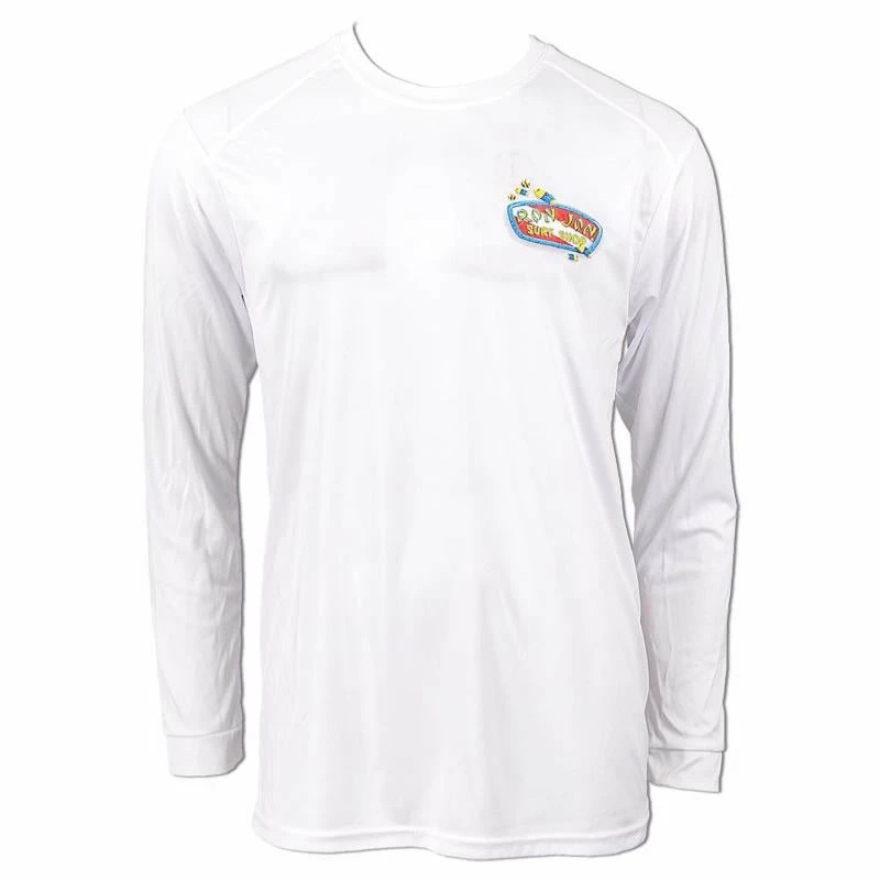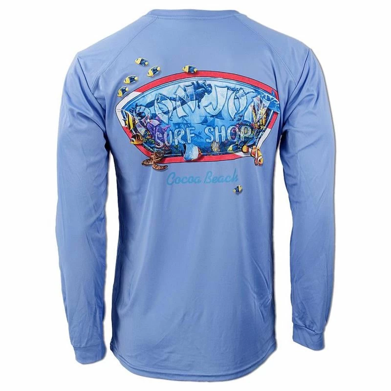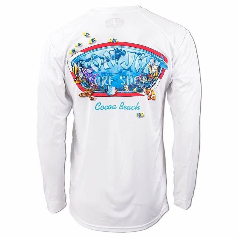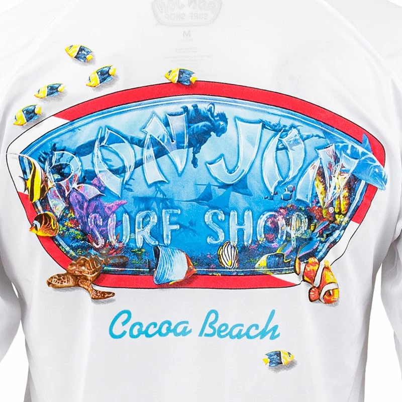 Ron Jon Dive Badge Long Sleeve Sun Shirt features an underwater dive scene complete with fish and a turtle. The special performance fabric features wicking technology that transfers moisture three times faster than normal performance tees and also offers a UPF rating of 50+ to help protect you from harmful solar rays.