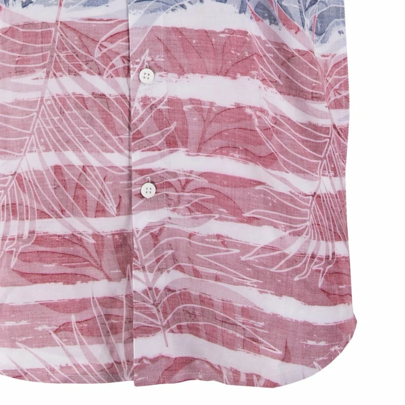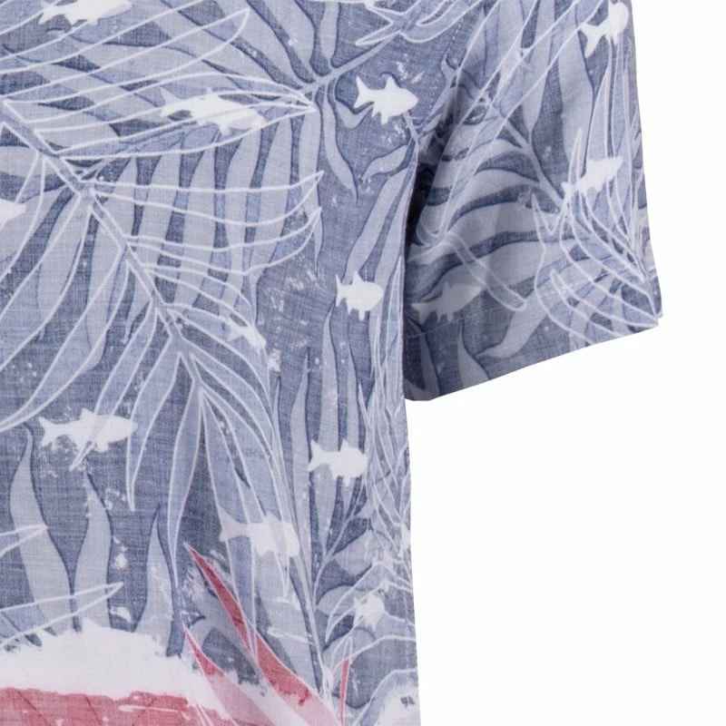The Ron Jon Goin With The Flow Shirt is a classic style Hawaiian shirt with a palm leaf and fish print. White buttons along the full button-up front. Print pattern may vary slightly.