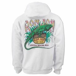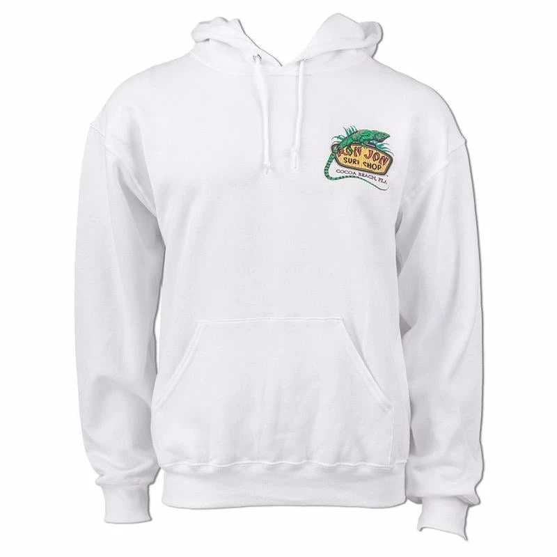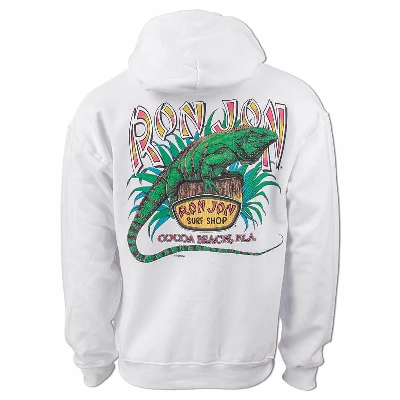 The Ron Jon Iguana Pullover Hoodie features a vibrant iguana sitting on a log surrounded by palm fronts..