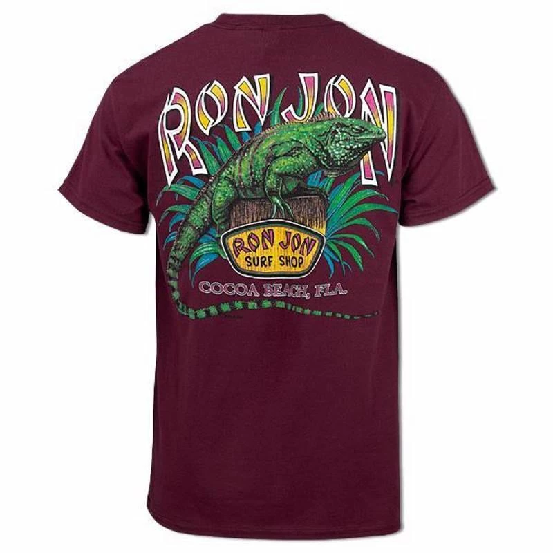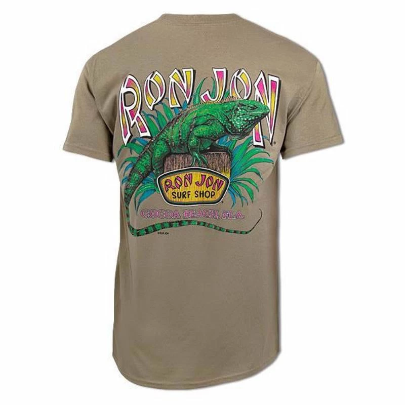 Iguanas can be found in Florida, they can grow up to 6 feet long, and they worship the sun, just like the people that flock to Florida every year for a tropical escape! The Ron Jon Iguana Tee features “Ron Jon” lettering above a green iguana that is perched over a tree trunk and surrounded by palm fronds. Below the iguana is the Ron Jon logo.