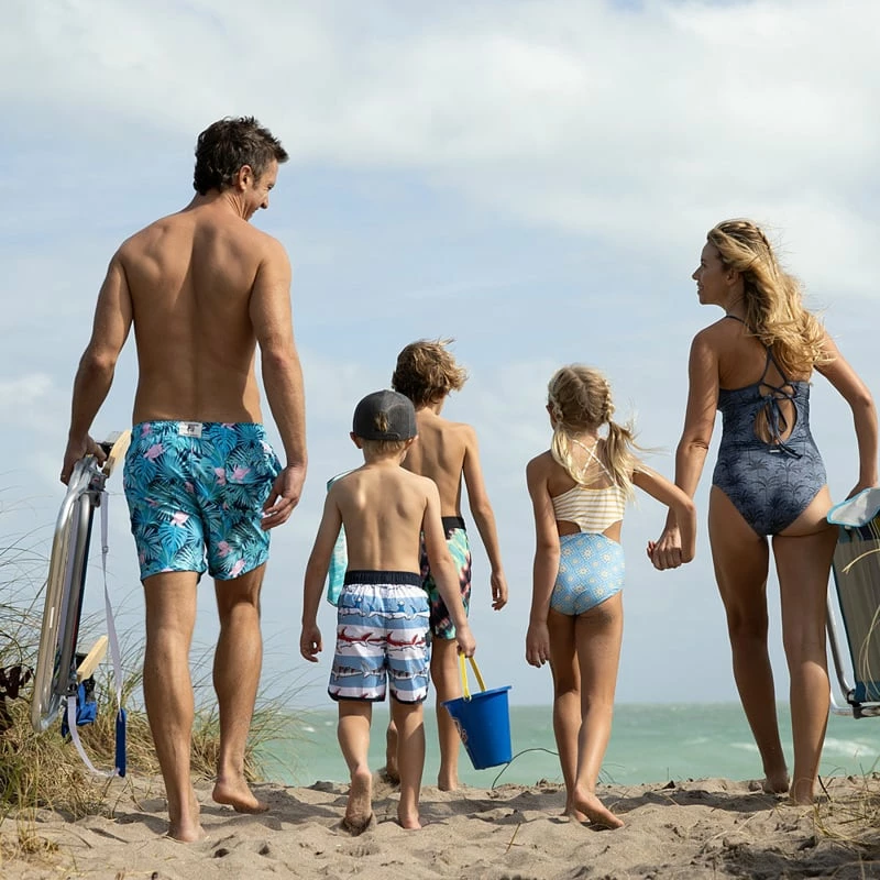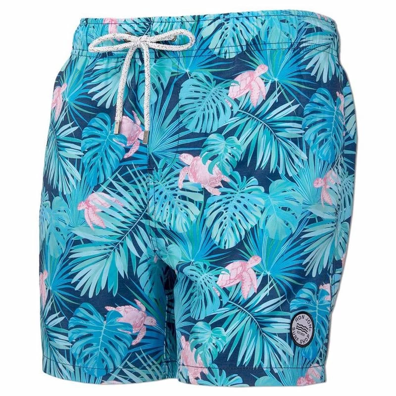 The Ron Jon Into The Night Swim Volley is a classic style men’s swimsuit from The Endless Summer® apparel line. The print on these men’s swim volleys feature a variety of tropical palm leaves with pink turtles swimming among them, in almost a dreamlike scene. Includes two front side slash pockets with mesh for drainage, and one patch style back pocket with drain grommet.