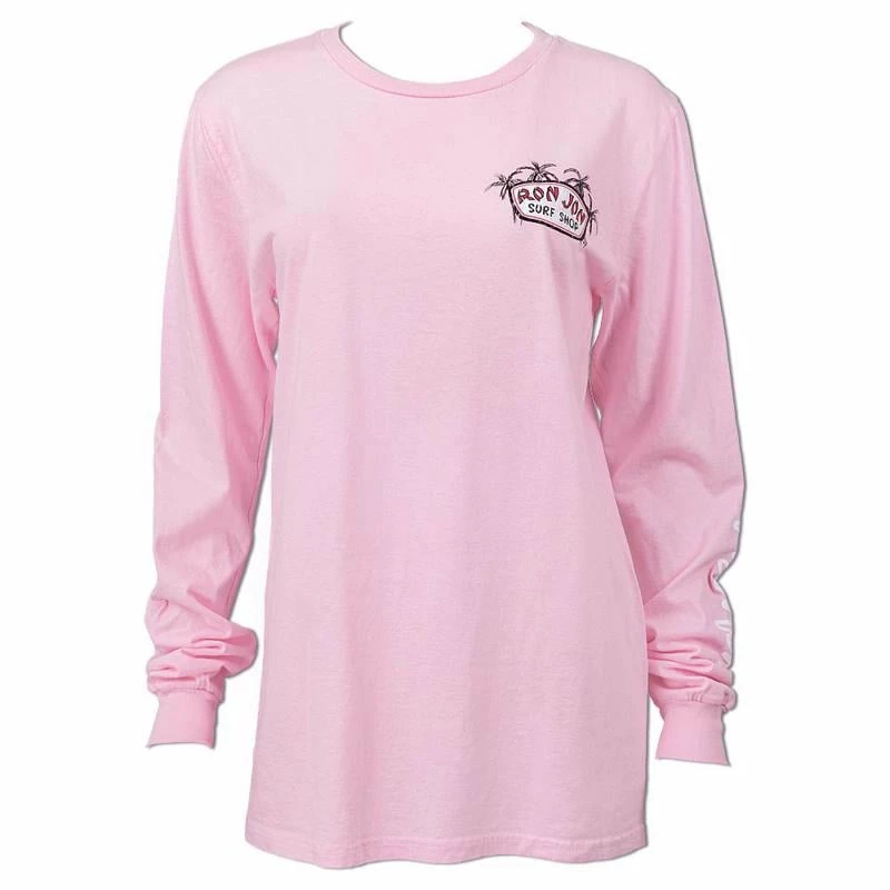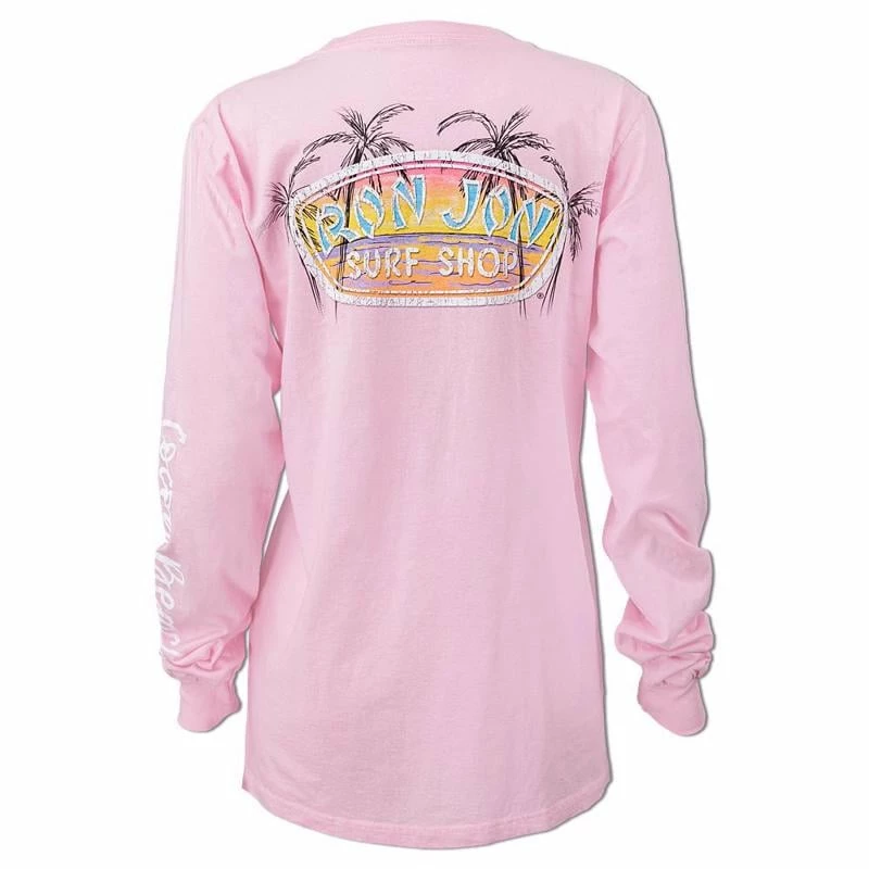 The Ron Jon Junior Sunset Badge Long Sleeve Tee features a distressed back graphic of our famous logo with a beautiful sunset and palm trees.