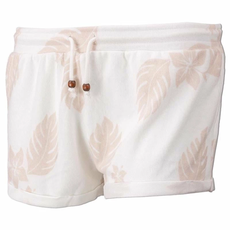 Relax or play in the Ron Jon Juniors Hacci Aloha Print Shorts featuring wooden bead accents on the adjustable drawstring.