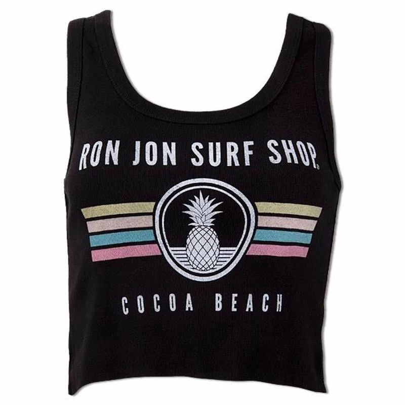 Stay cool this summer with the Ron Jon Juniors Picture Ribbed Crop Top. This top features a tank top cut, a retro decal with colorful stripes surrounding a pineapple, and the words Ron Jon Surf Shop Cocoa Beach.