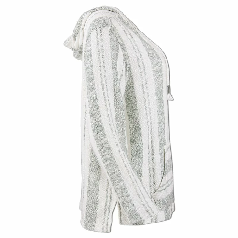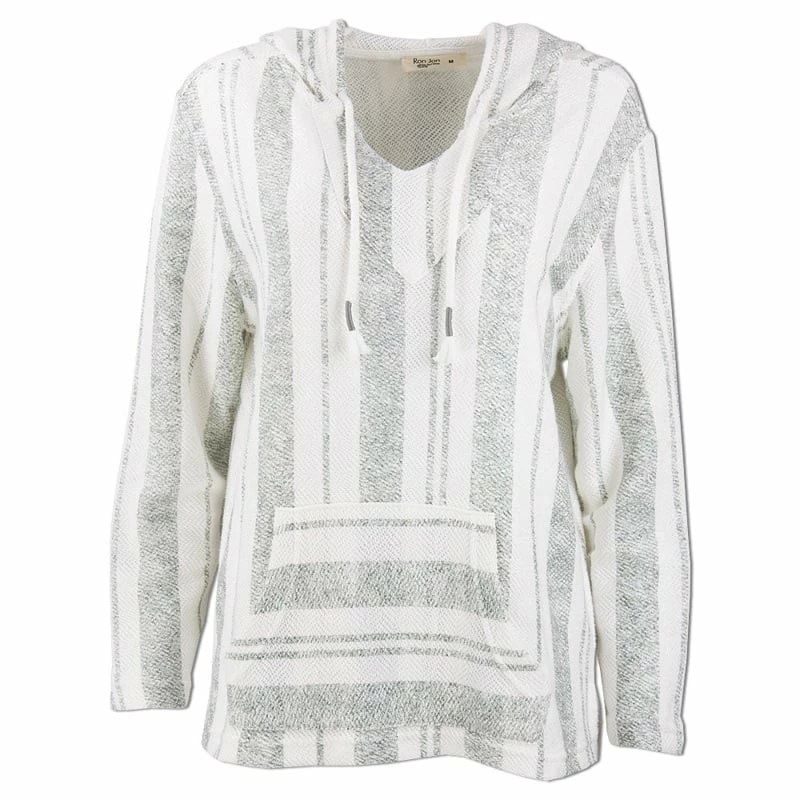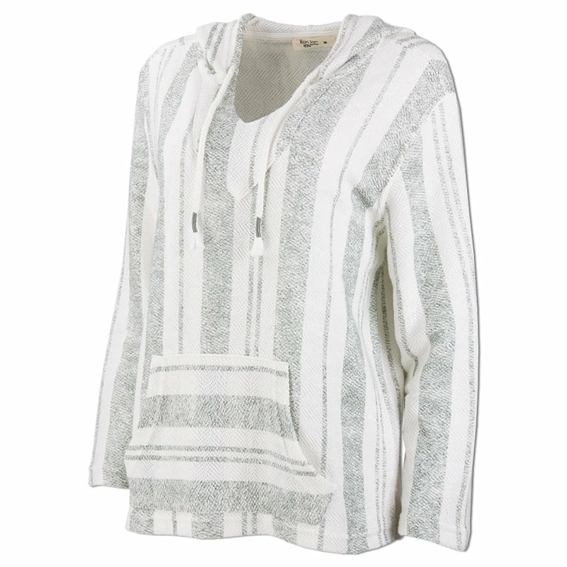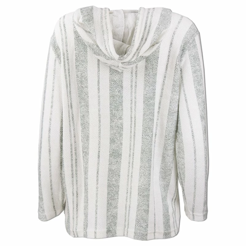 The Ron Jon Juniors Striped Baja Pullover Hoodie features a knit like material with stripes going downward, a drawstring hood, and a front pouch pocket.