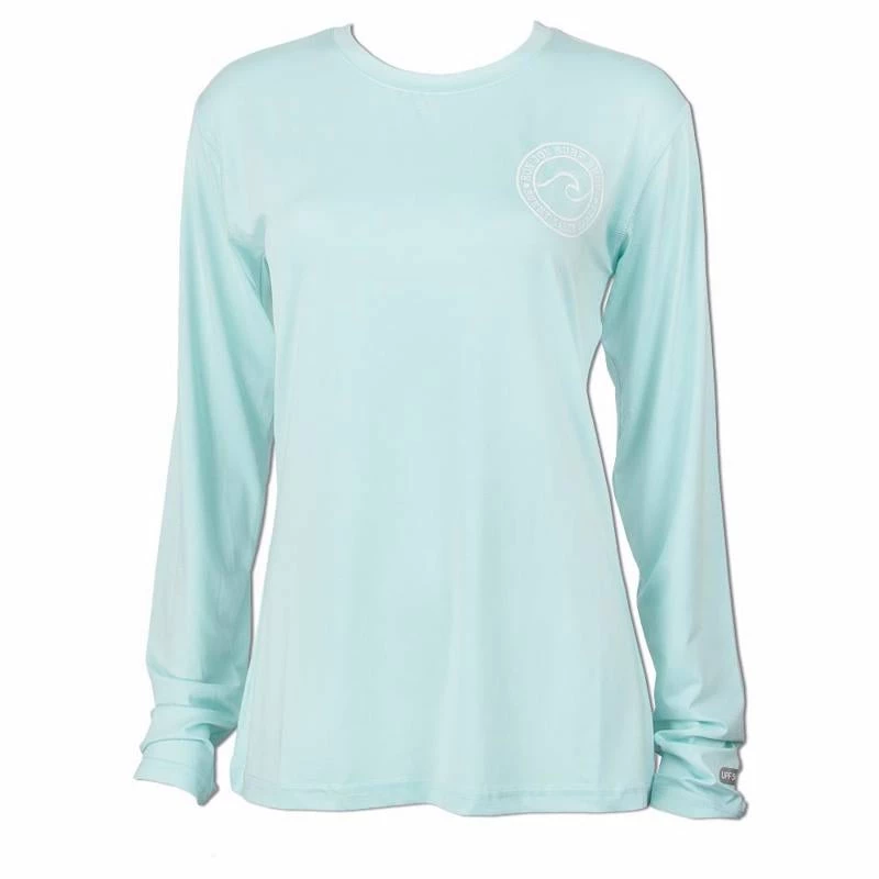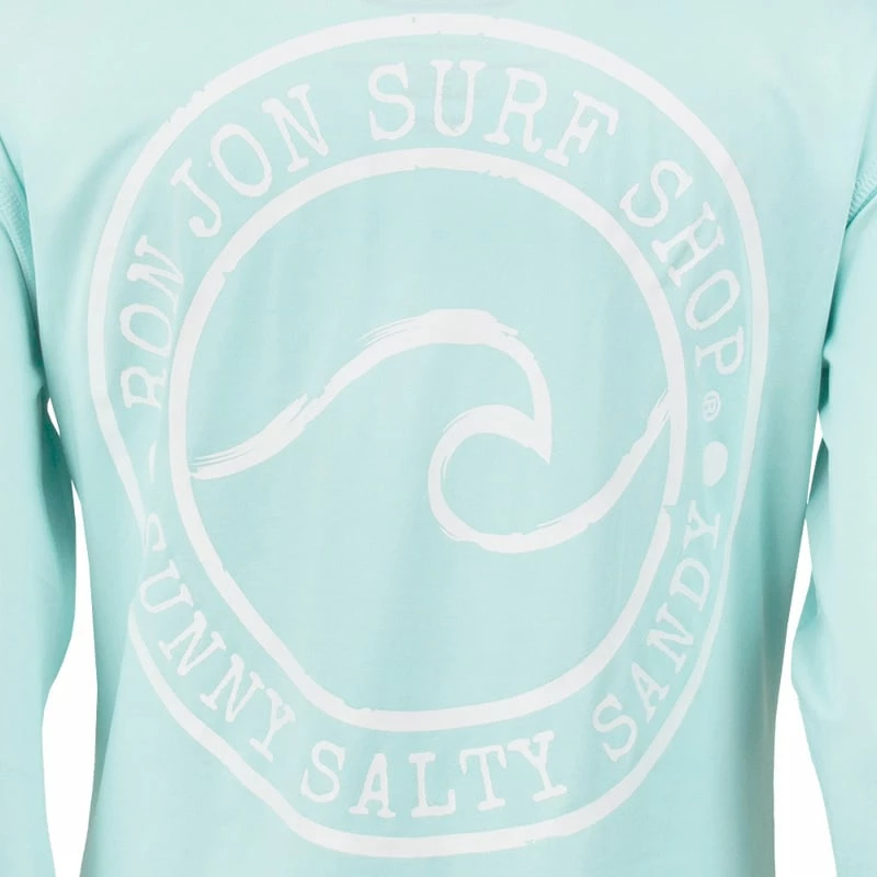 The Ron Jon Juniors Sunny Salty Sandy Long-Sleeve Sun Shirt is a great option as a swimsuit cover-up or as a top to wear while running your daily errands. The performance material offers sun protection with a UPF 50+ rating. Circular graphic with a cresting wave and Ron Jon Surf Shop Sunny Salty Sandy lettering. Large graphic on the back, a smaller version on the front.