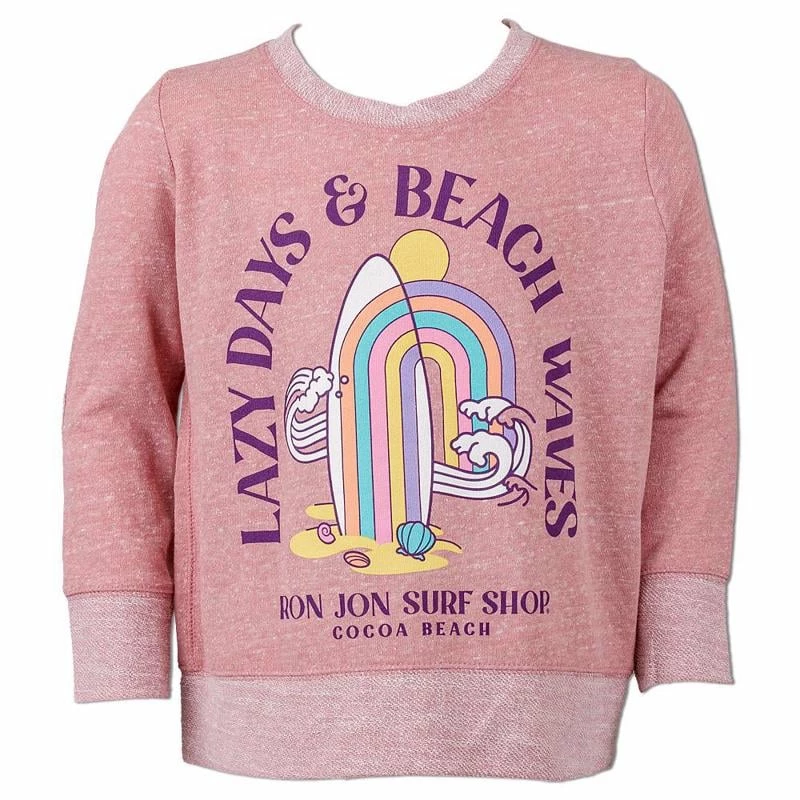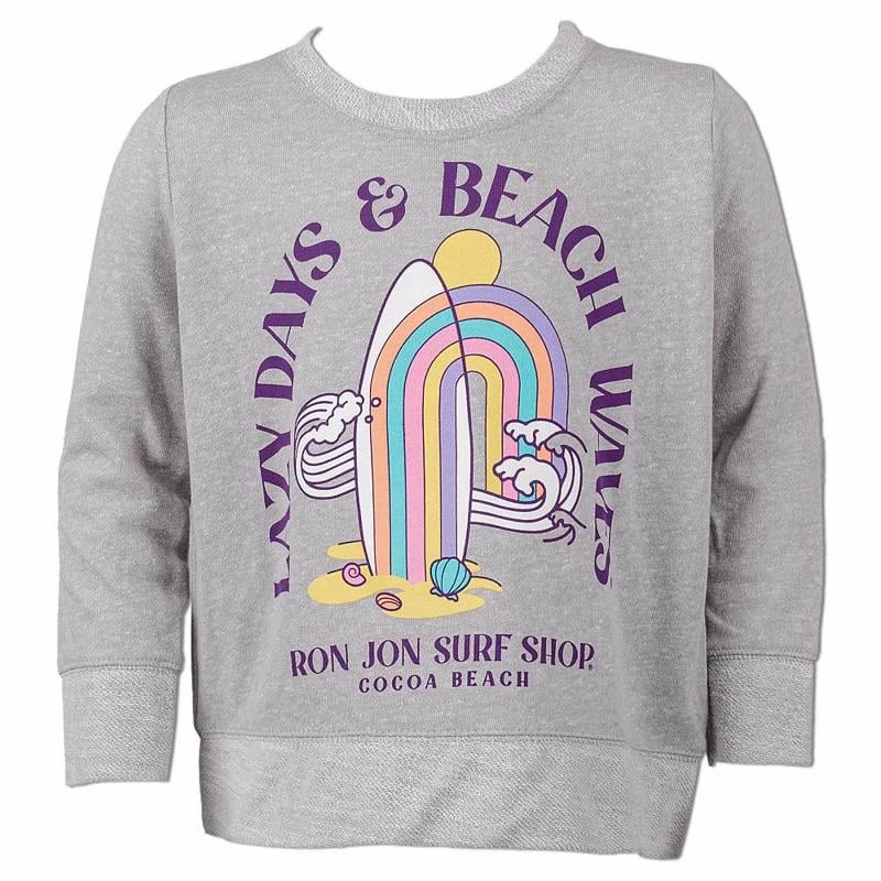 A rainbow of colors washes over a surfboard in the sand on the front of this Ron Jon Kids Lazy Day Sweatshirt. This fleece also features the words “Lazy Days & Beach Waves” and has Ron Jon Surf Shop Cocoa Beach lettering.