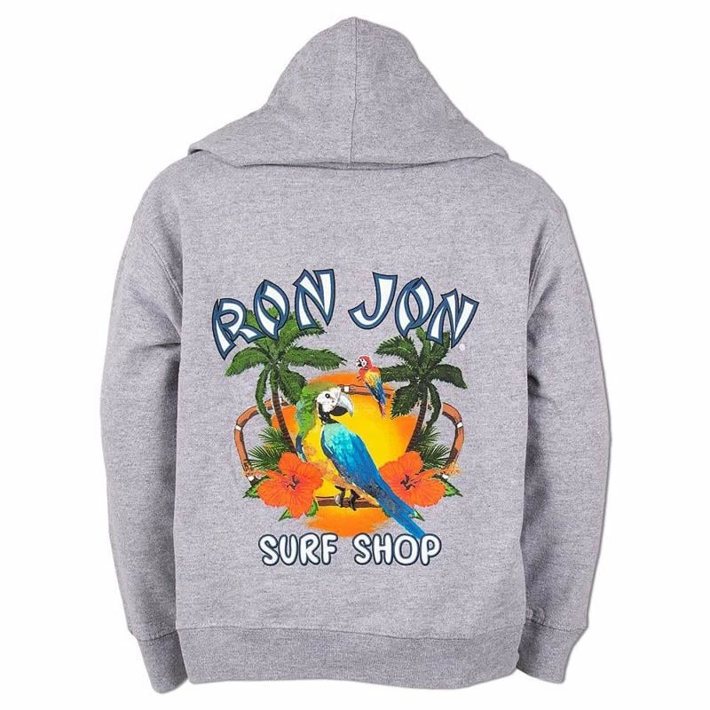 The Ron Jon Kids New Parrot Badge Hoodie is a long-sleeve pull-over hoodie with a back graphic of two parrots sitting in a tropical setting with palm trees at sunset. The front has a small Ron Jon badge logo.