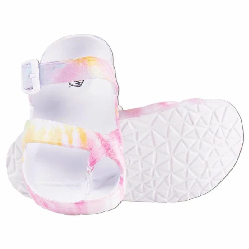 The Ron Jon Kids Reva Pink and White Sandal features one adjustable strap and one fixed strap that is integrated into a toe holder.