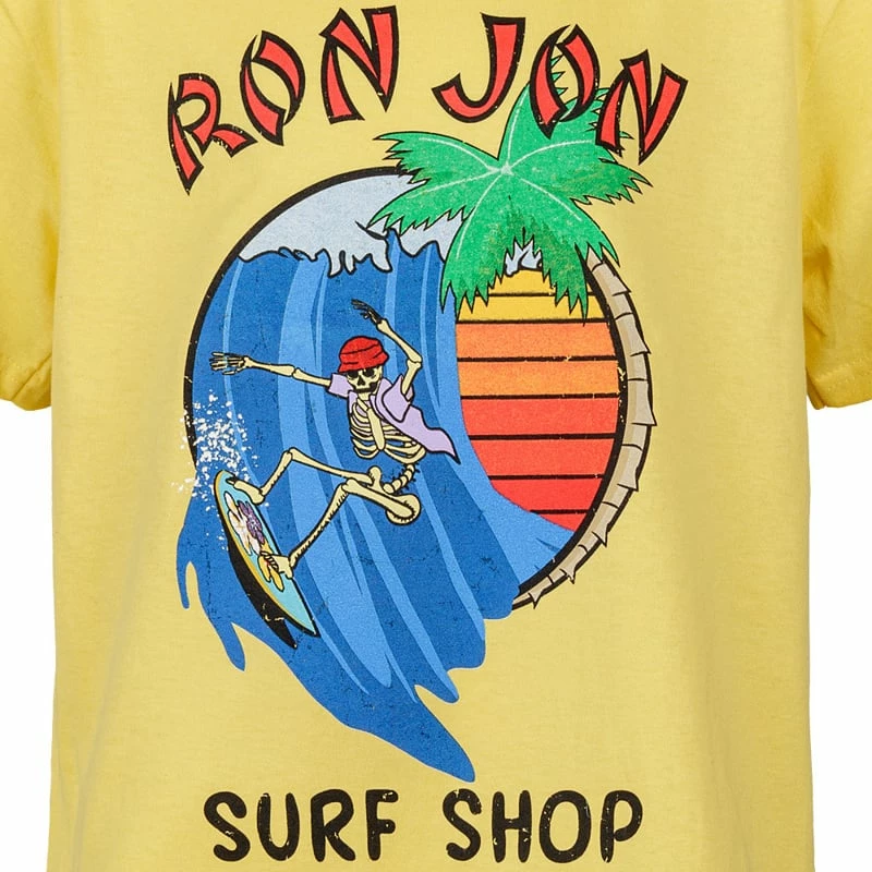 The Ron Jon Kids Skeleton Surfer Tee is a youth cut short sleeve t-shirt that features a skeleton in a bucket hat and button-up shirt surfing an awesome wave. The graphic is on the front of the shirt only and has distressed elements.
