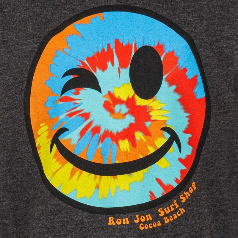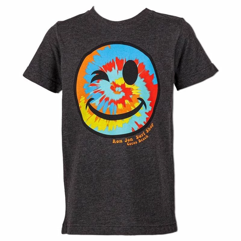 The Ron Jon Kids Tie-Dye Smiley Tee is a short sleeve t-shirt in a youth cut. It features a colorful tie-dye graphic on the front of a winking smiley face.