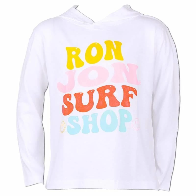 Ron Jon Kids Long Sleeve Hooded Tee is lightweight enough to use as a cover-up or for layering. The bright, bold lettering is joined by two smiley faces.