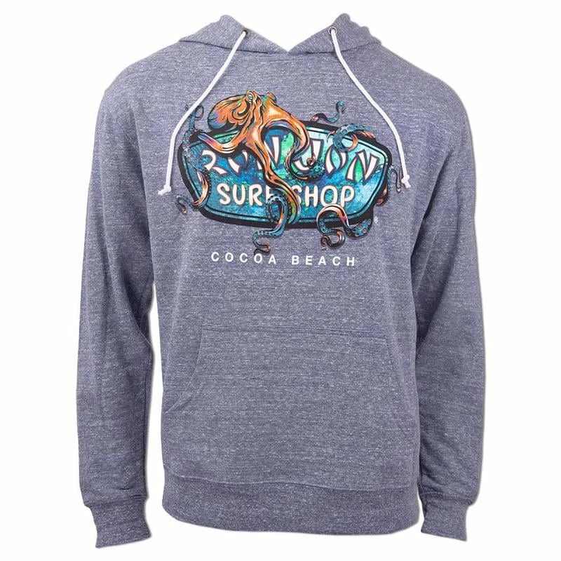 The lightweight Ron Jon Kraken Fun Pullover Hoodie features a colorful Trusty Badge with an octopus wrapping itself around it.