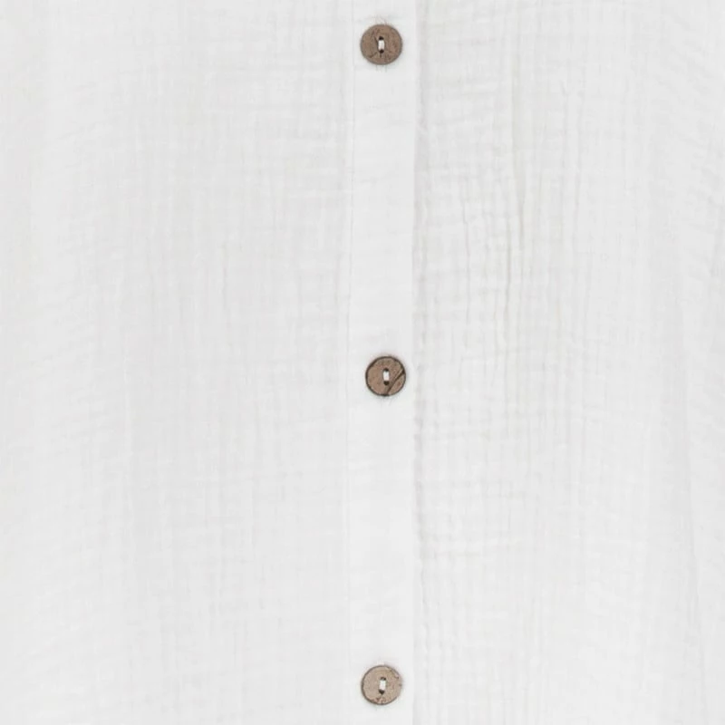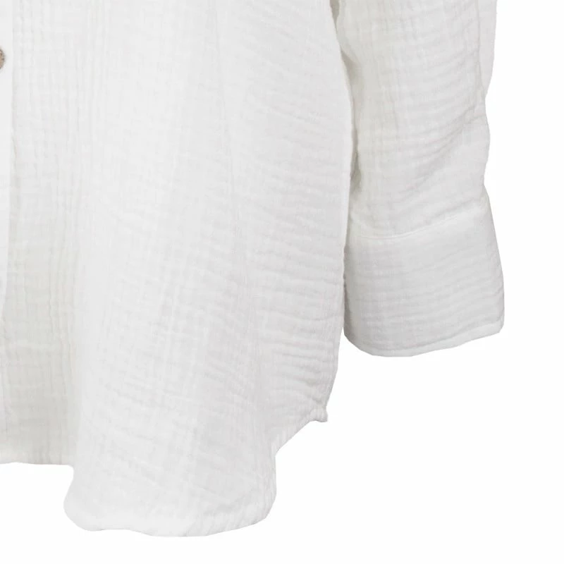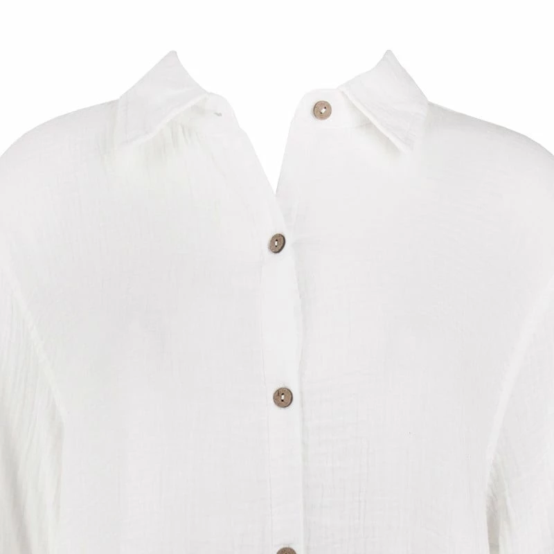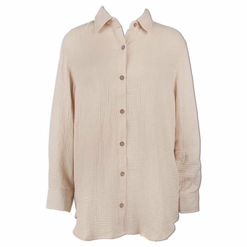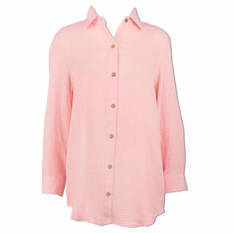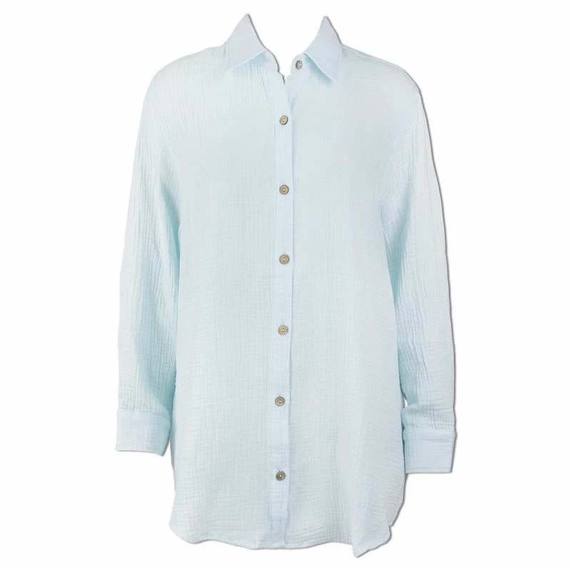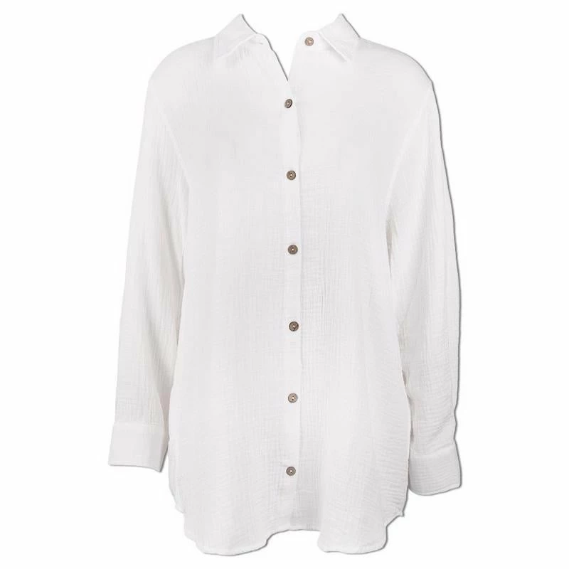 The Ron Jon Ladies Gauze Long Sleeve Button Down Shirt features a lightweight gauze material and wood buttons, perfect for a breezy day on the beach.