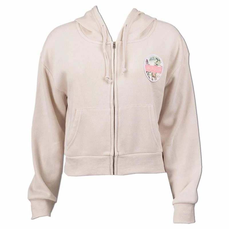 The Ron Jon Ladies Patch Burnout Crop Zip Hoodie features a lightweight, soft fabric with pretty floral patch on the front left chest.