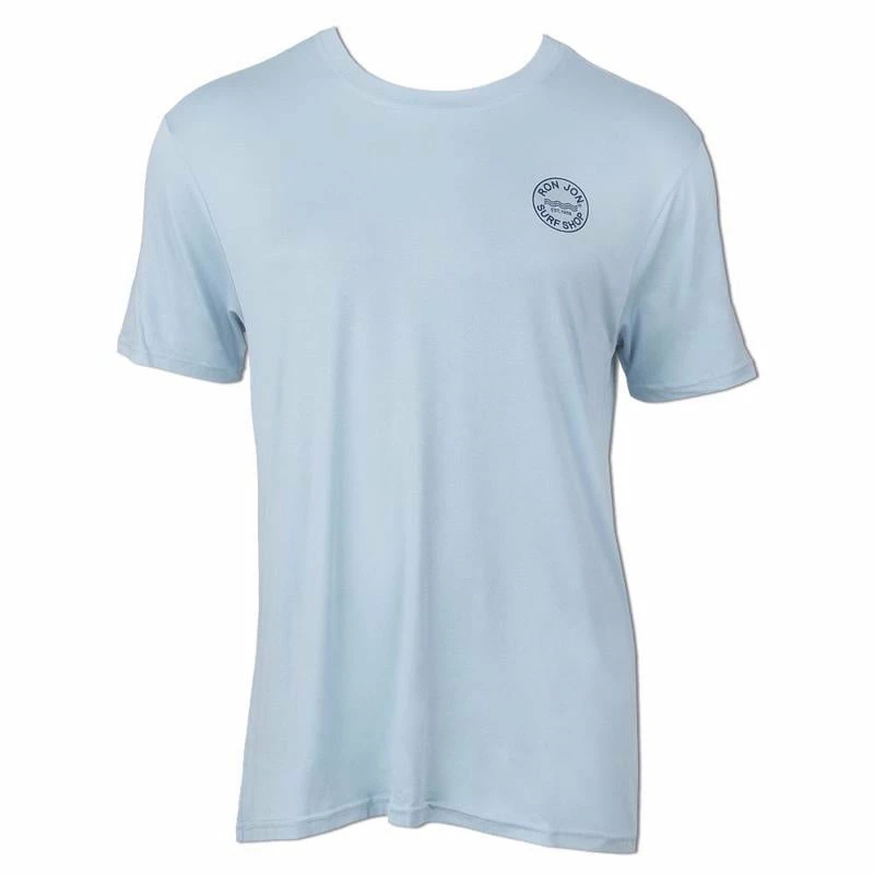 The Ron Jon Light Blue Sun Shirt features a material that quickly dries, moisture wicks, breathability, and UV protection, making it a great choice for a day out in the sun.