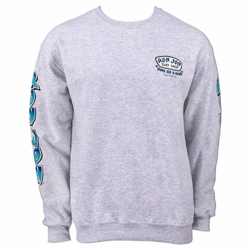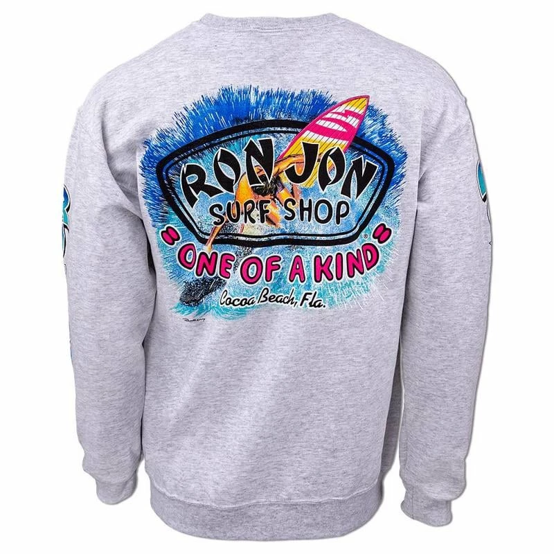 Our popular Maui Surf design is now available on a crew neck style sweatshirt. Bright vivid colors are featured in the surf graphic on the back, with the Ron Jon logo on the front. On both sleeves, features Ron Jon lettering going down each arm.