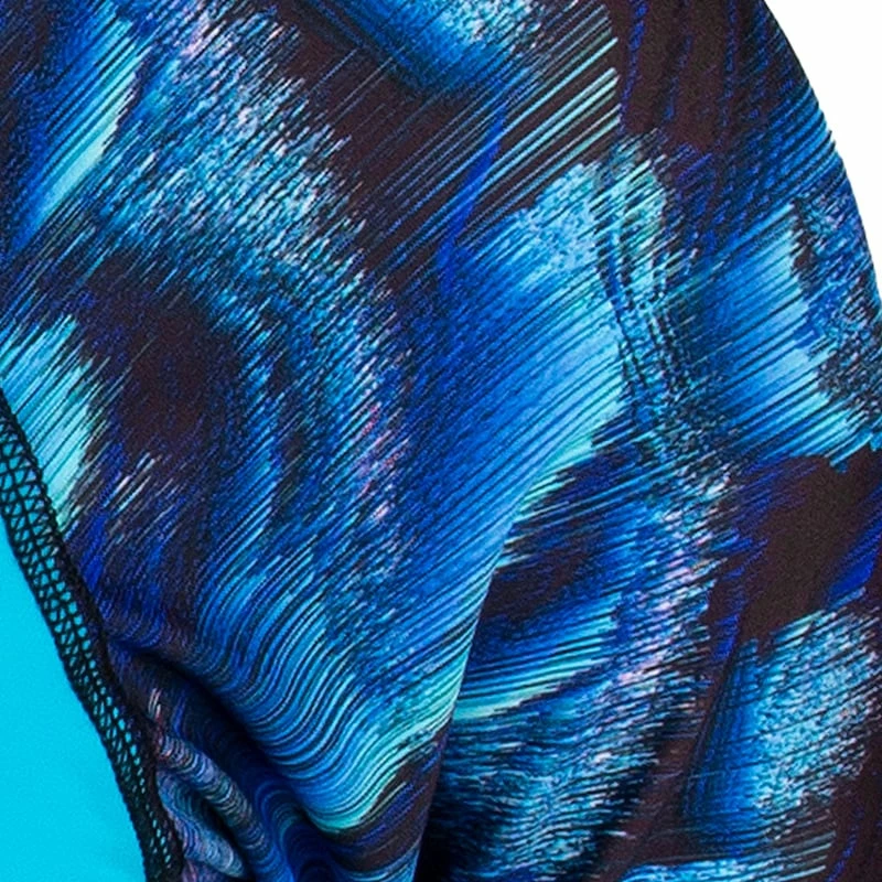 Protect yourself from harmful UVA & UVB rays with the Ron Jon Mens Blue Rash Guard. It features a badge logo screen print on the front and multi-colored stripes on the sleeves.