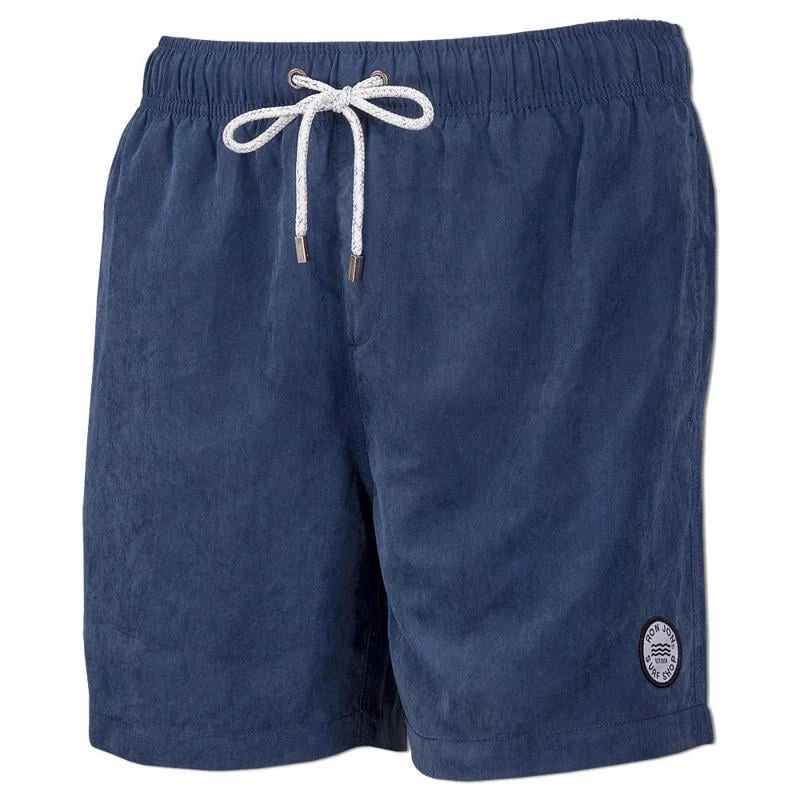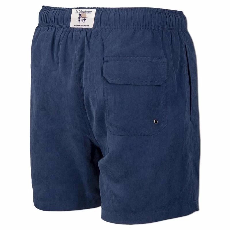 The Ron Jon Navy Dayz Swim Volley is a classic style men’s swimsuit from The Endless Summer® apparel line. The material has a soft suede-like feel, giving it that extra elevated appearance. Includes two front side slash pockets with mesh for drainage, and one patch style back pocket with drain grommet.