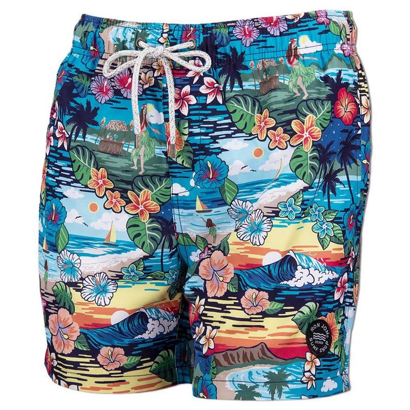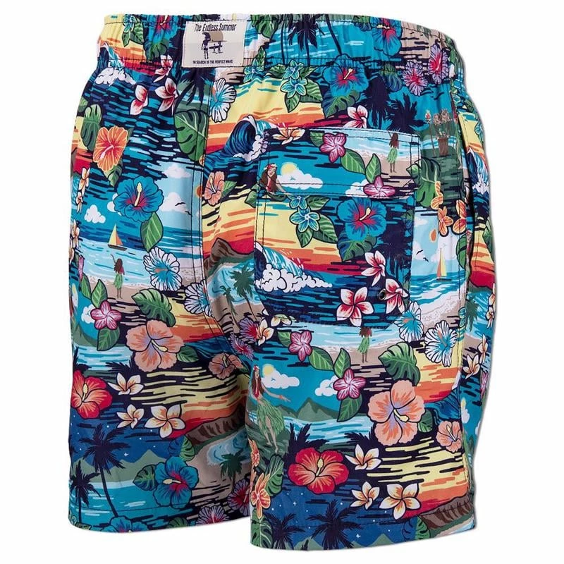 The Ron Jon Party At Sunset Swim Volley is a classic style men’s swimsuit from The Endless Summer® apparel line. The print on these men’s swim volleys is bright and colorful, just like a tropical sunset. Includes two front side slash pockets with mesh for drainage, and one patch style back pocket with drain grommet.