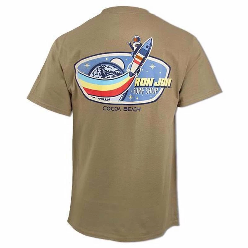 Spark your curiosity about space with the whimsical Ron Jon Retro Astro Surfer Tee! This tee features a retro-like design of an astronaut riding a rocket from the outside while holding up the shaka hand gesture. In the background are a planet, moon, and stars.Â