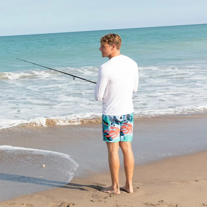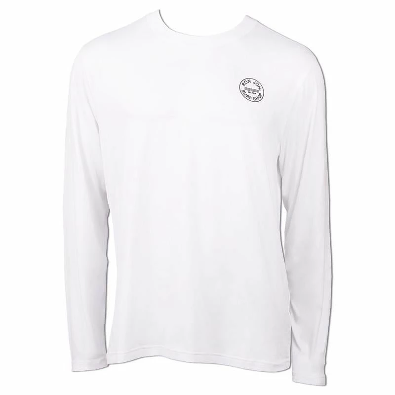 The Ron Jon White Long Sleeve Sun Shirt features a material that quickly dries, moisture wicks, breathability, and UV protection, making it a great choice for a day out in the sun.