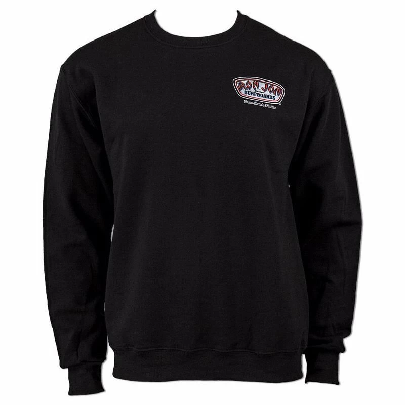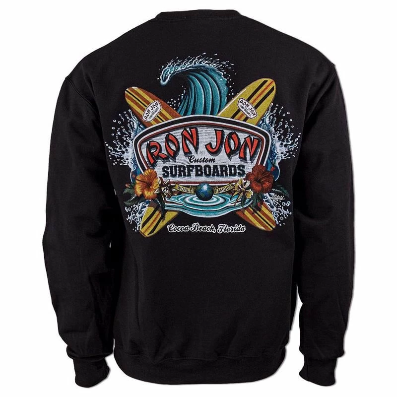 This crew neck long sleeve sweatshirt from Ron Jon features a small wood grain style Ron Jon badge logo on the front. The back has a large graphic featuring surfboards, tropical flowers, and big waves.