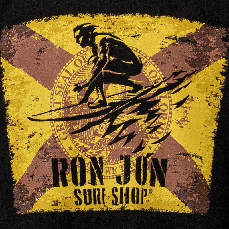 A flag and a surfer silhouette are featured on the front of this Ron Jon Youth Florida Flag Surf Tee. The graphic has a deliberately distressed look.