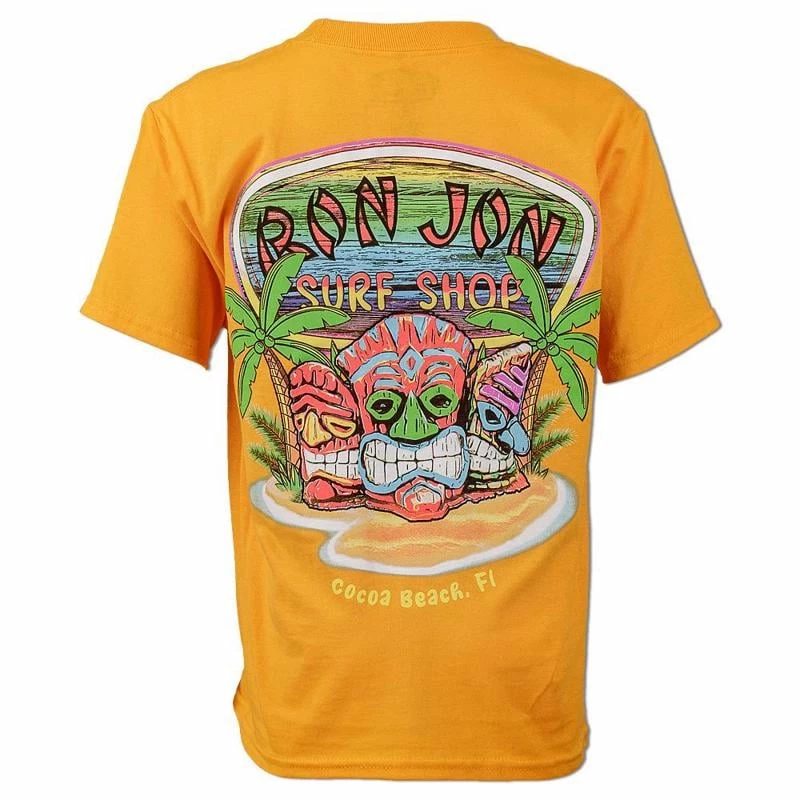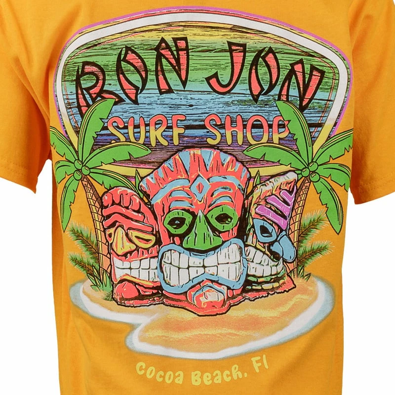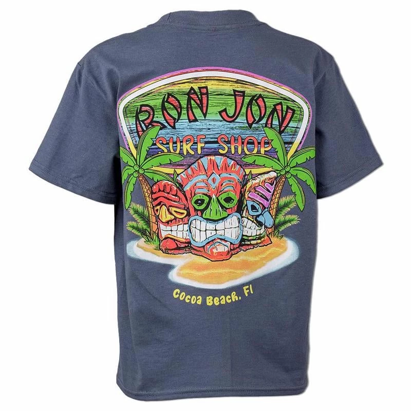 Ron Jon Youth Tiki Tropical Island Tee features a vibrant tiki and palm tree screen print graphic.