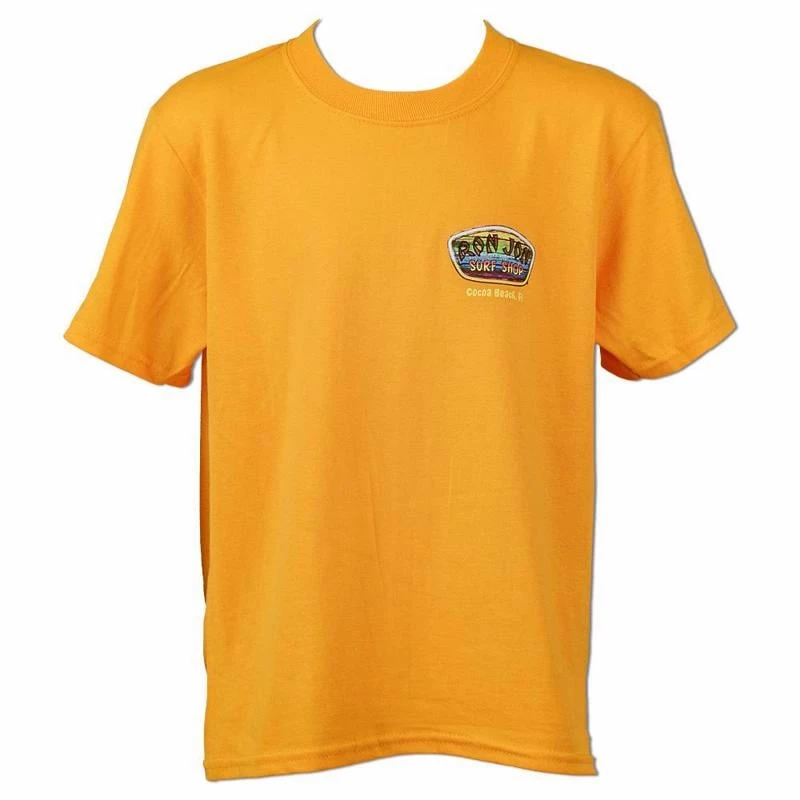 - Ron Jon badge logo on front left chest with Cocoa Beach, Fl lettering