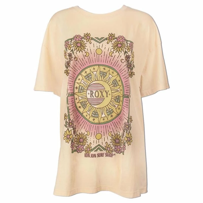 The Roxy Ron Jon Juniors Mystic Tee features a faded graphic of the sun with the moon and the Roxy name within it. Around the sun are the cycles of the moon, stars, and flowers.