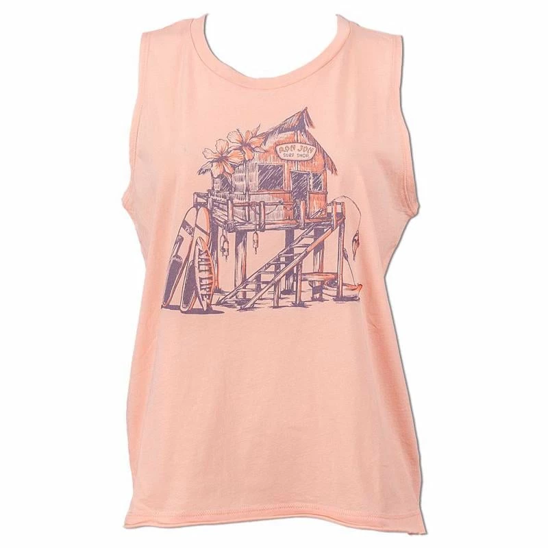 This lightweight collaboration tank top from Salt Life and Ron Jon features a hideaway beach hut graphic with a surfboard, paddleboard, and kayak.
