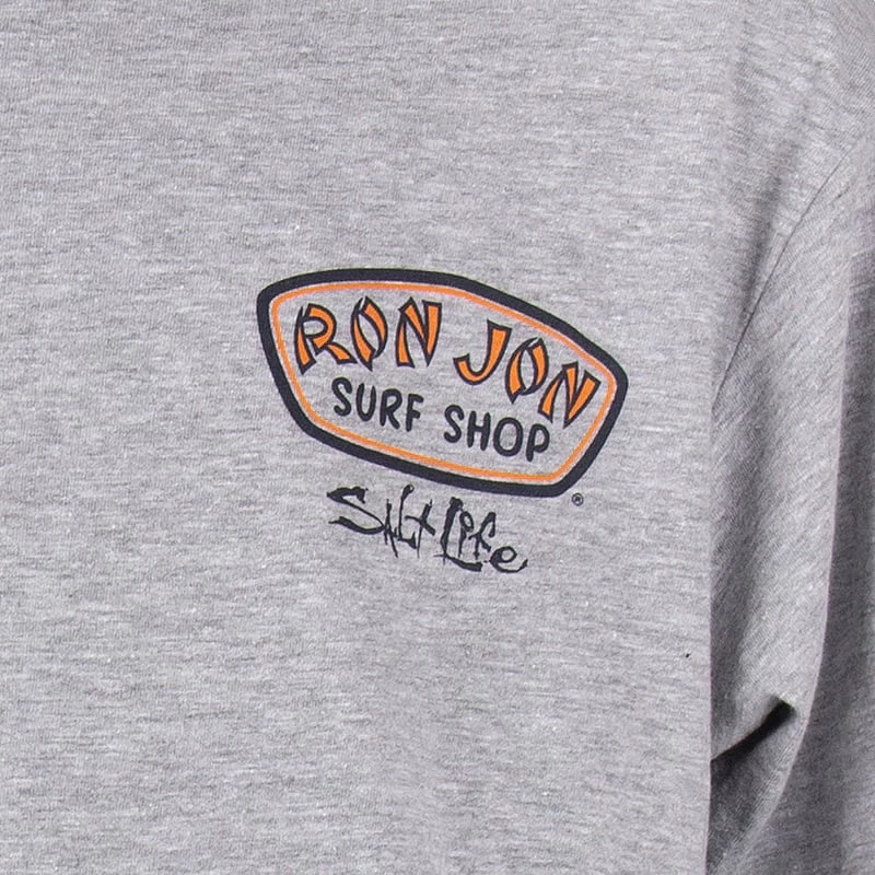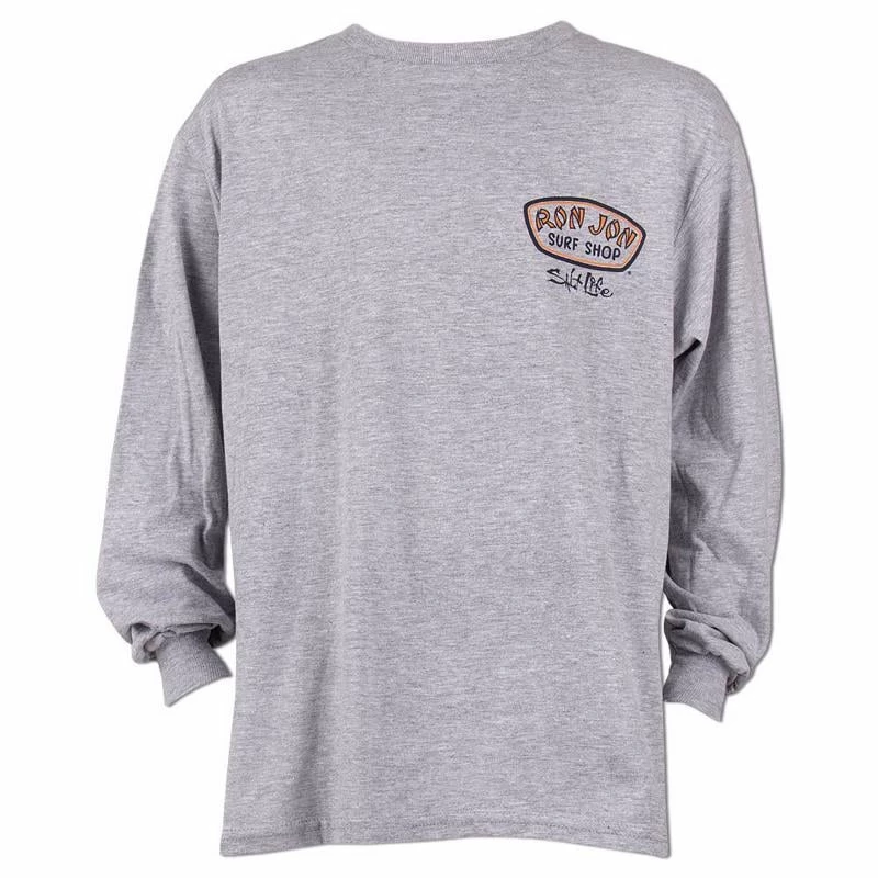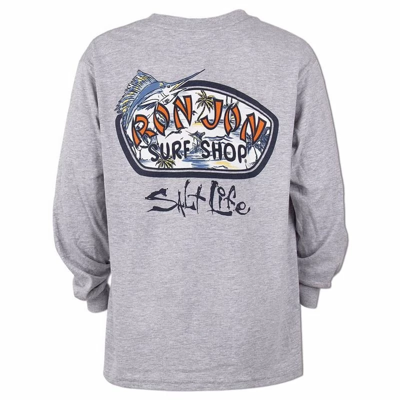 The Salt Life Ron Jon Kids Sea Escape Long Sleeve Tee is part of our collaboration apparel line and features a back graphic with jumping sailfish. Logos for both companies are printed on the front.