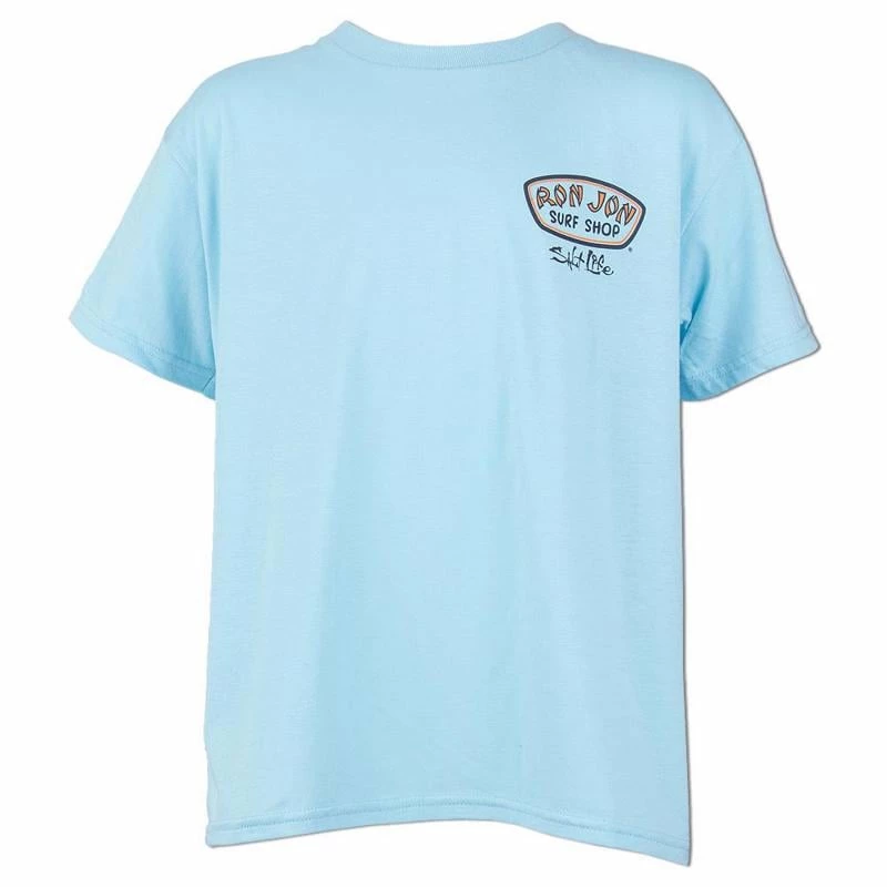 The Salt Life Ron Jon Kids Sea Escape short sleeve t-shirt is part of our collaboration apparel line and features a back graphic with jumping sailfish. Logos for both companies are printed on the front.