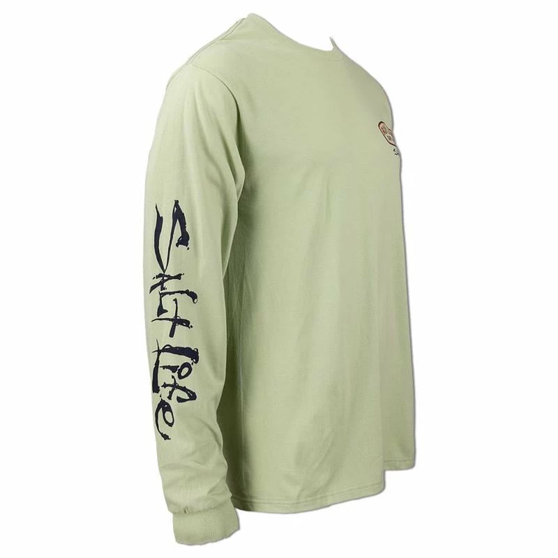 Salt Life Ron Jon Long Sleeve Sea Escape Tee is a collaboration t-shirt featuring the Ron Jon Surf Shop and Salt life logo and an ocean screen print graphic.