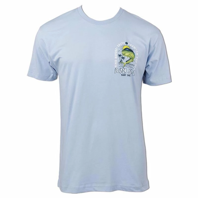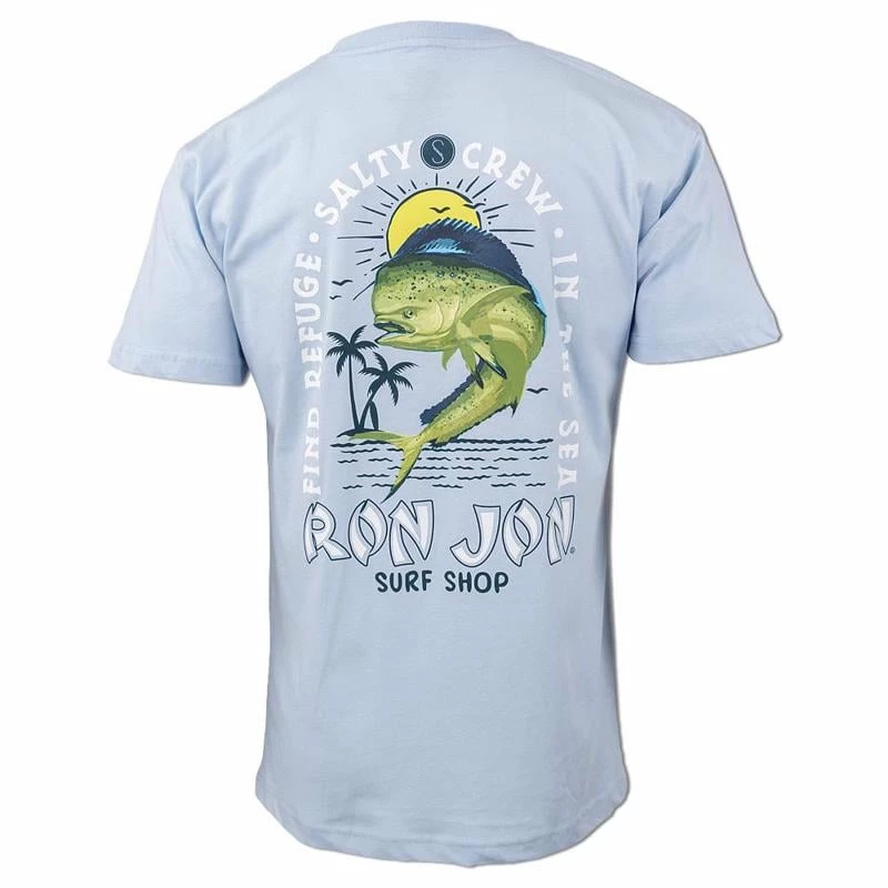 The Mahi Mayhem collaboration short sleeve t-shirt from Salty Crew and Ron Jon Surf Shop features a large back graphic of a Mahi fish jumping with the sun in the background. Around the graphic is the phrase “Find Refuge In The Sea” as well as both company names. Smaller version on the front.