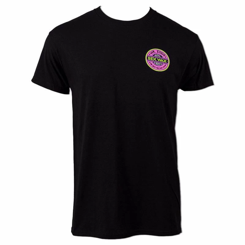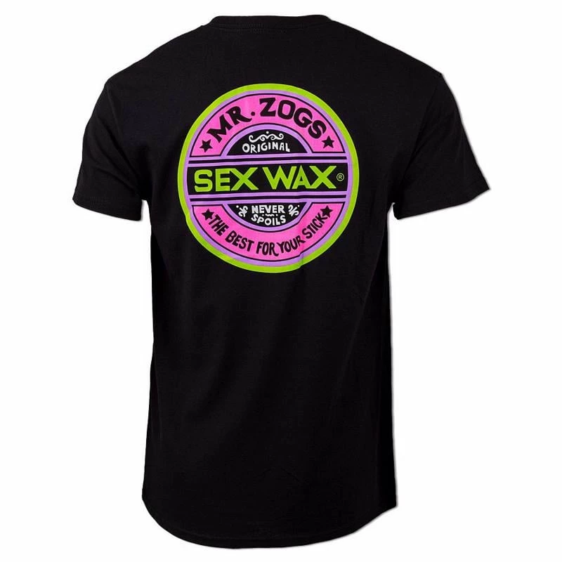 Reminiscent of the blacklight artwork from the ’60s and ’70s, this short sleeve t-shirt features the Mr. Zogs Sex Wax logo with a bright neon fluorescent color background. Large version on the back, smaller version on the front.