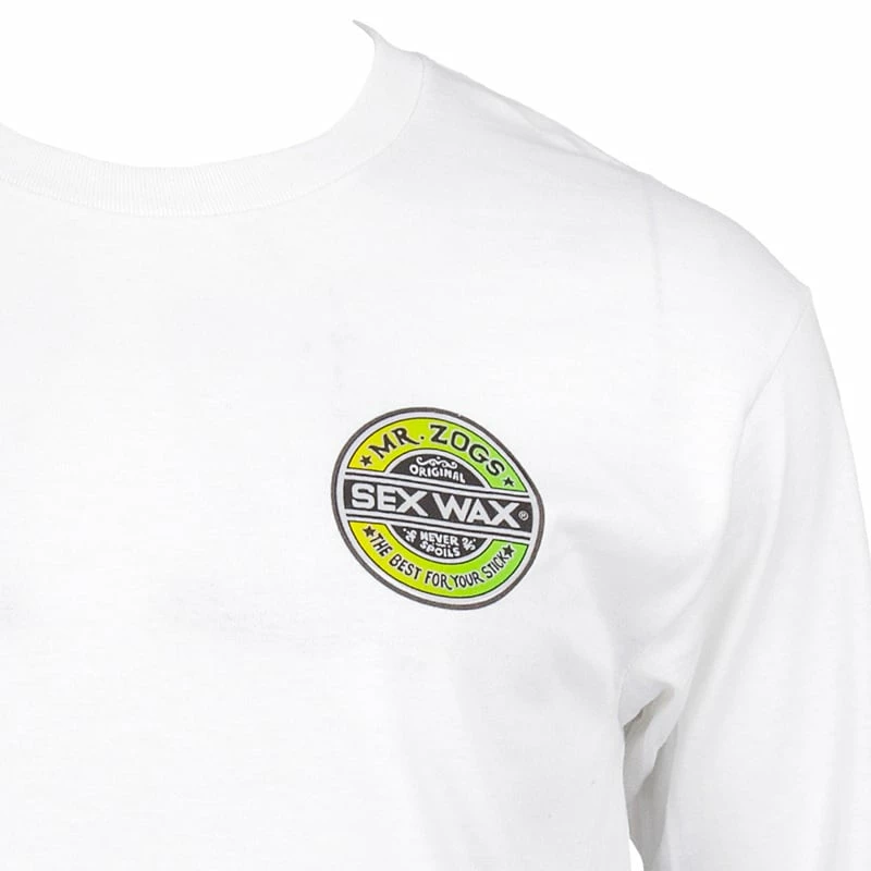 This cotton long-sleeve t-shirt features the famous Mr. Zogs Sex Wax logo with a dual color gradient fade background. Large version on the back, a smaller version on the front. Plain sleeves.