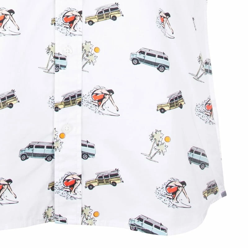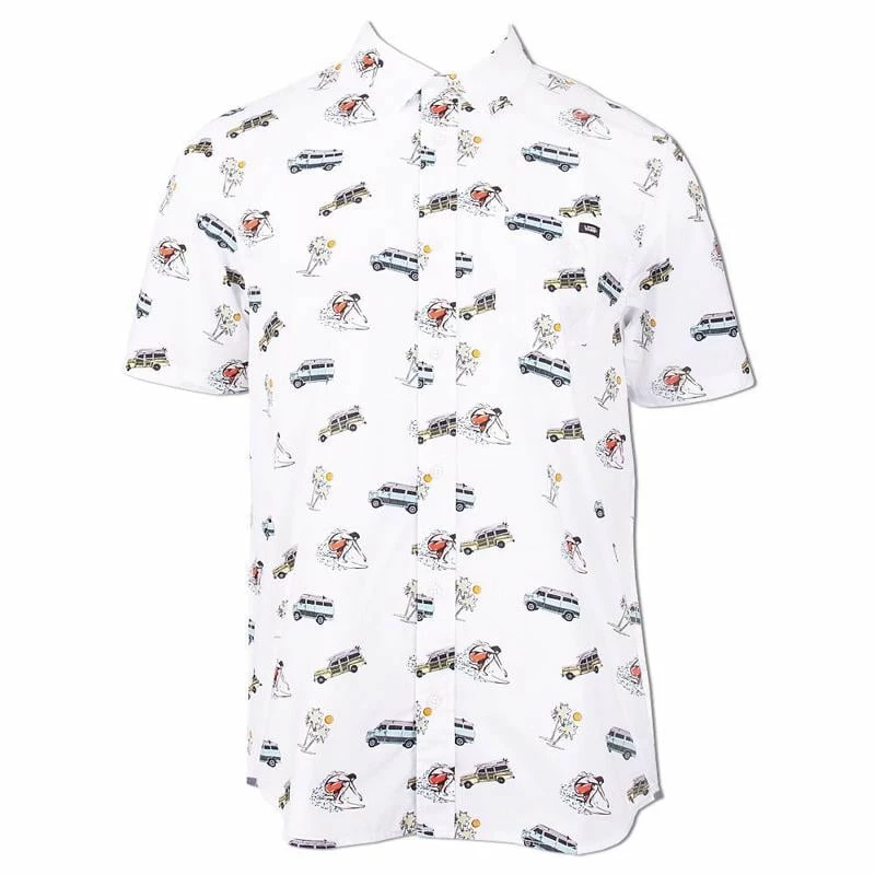 The Vans Ron Jon Full Day Short Sleeve Shirt is the perfect shirt for any occasion. It features surfers catching waves, sunny beaches, and classic surf cars like the classic woody.