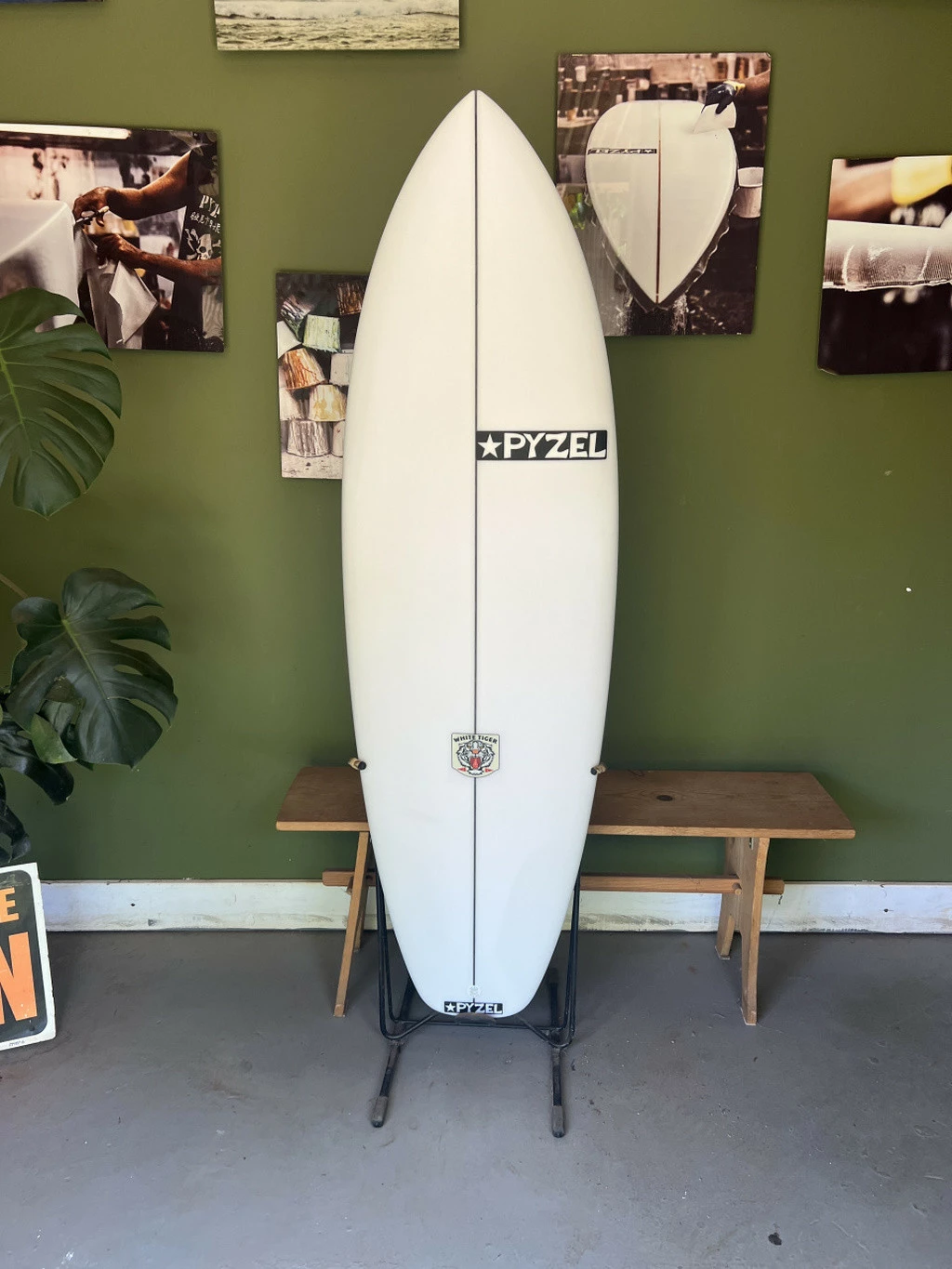 It has a clean but stubby outline, with a very full nose and wide squash tail. There is no hip and the wide point is 1 ½” forward of the center. The tail measurement is just slightly wider than the nose.